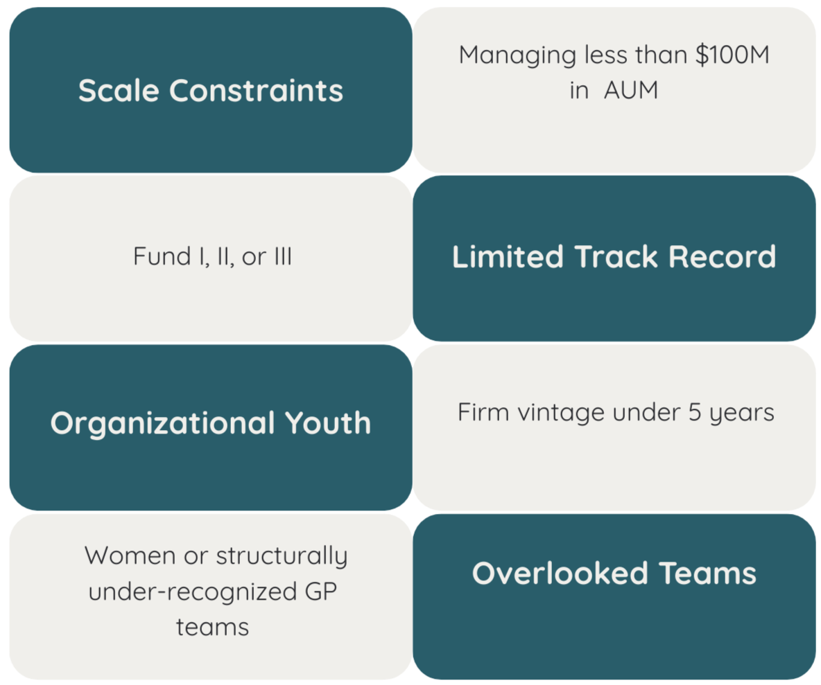 Emerging managers are defined by systematic exclusion from institutional search processes, not by demographics or identity.